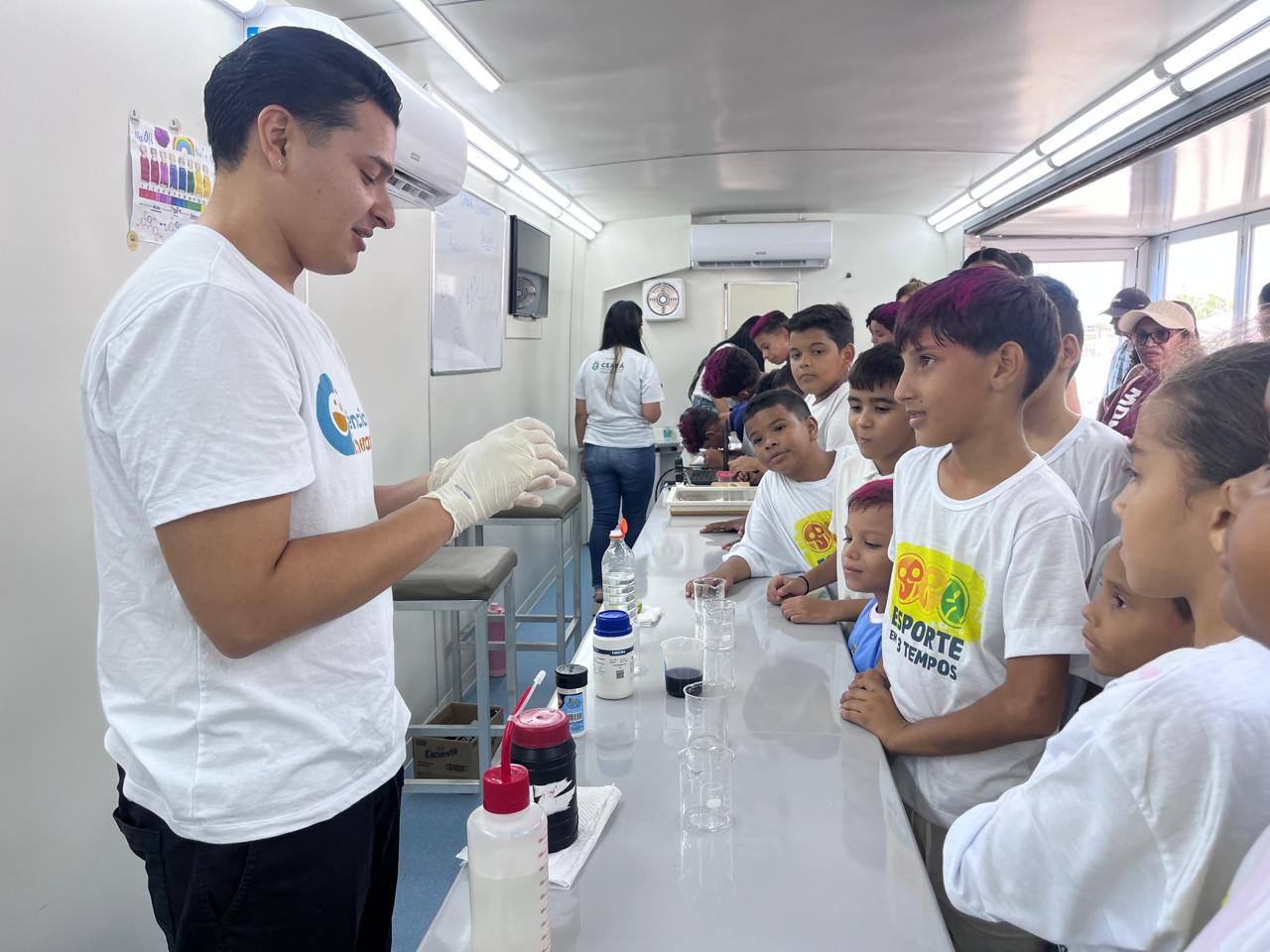 Na ciência itinerante, as crianças vivenciaram experiências e aprendizado com fosseis. Por meio de um ônibus-laboratório totalmente equipado e climatizado, com monitores de diversas áreas do conhecimento, o projeto ofereceu experiências científicas e demonstrações práticas.