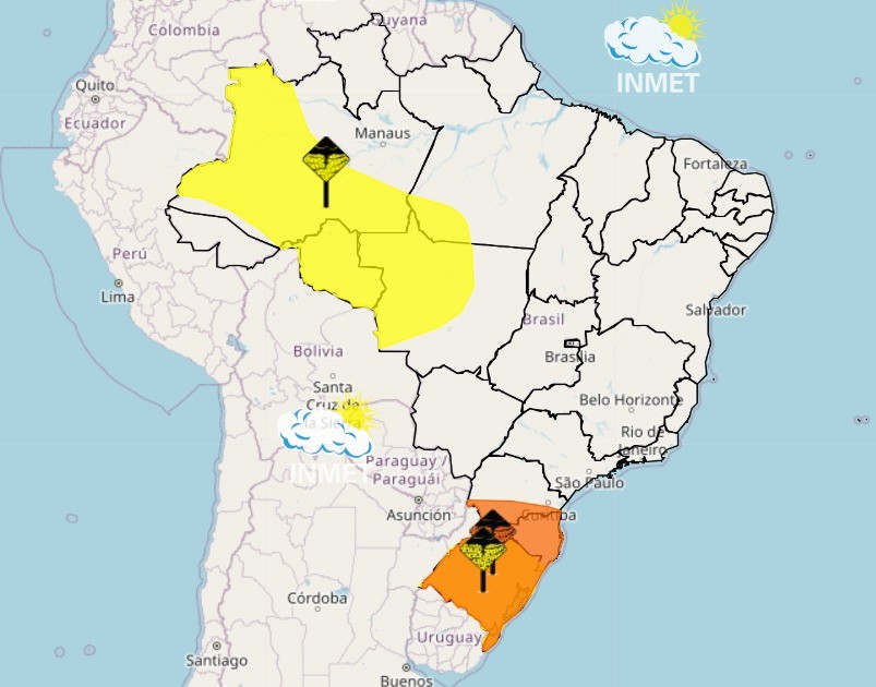 Um alerta laranja publicado pelo Instituto Nacional de Meteorologia (Inmet) indica “perigo” para tempestades em parte da região Sul nas próximas horas.