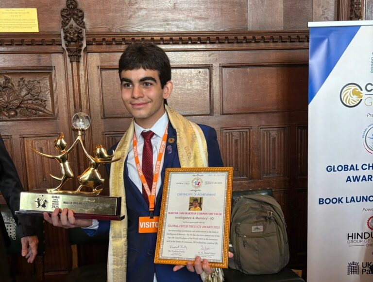 Aos 16 anos, o brasileiro Caio Temponi voltou a ganhar destaque internacional ao receber o Global Child Prodigy Awards 2025, em cerimônia realizada no Parlamento Britânico, em Londres. Reconhecido na categoria Inteligência e QI, Caio foi homenageado como um dos 100 jovens prodígios do mundo e se tornou o mais jovem premiado entre todas as categorias do evento.