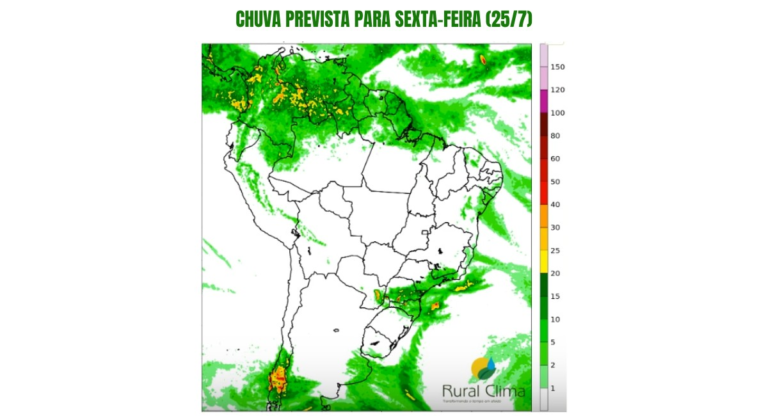 A previsão é que as instabilidades avancem lentamente a partir desta quinta-feira (24/7) e, na sexta-feira (25/7), as chuvas atinjam, forma pontual, a faixa leste de São Paulo. No sábado (26/7), os modelos analisados pela Rural Clima apontam novos episódios de chuva no na região Sul.