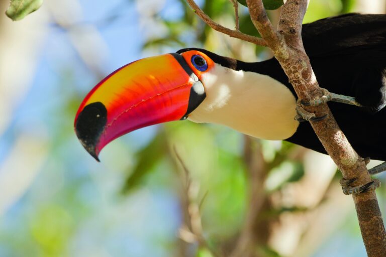 A beleza que se destaca na face do pássaro é o que mais chama atenção no animal, que tem o corpo coberto por penas negras. Como se fosse um adereço que o tucano carrega na boca por onde voa, o bico poroso e leve é mais conhecido pela cor amarela, mas há outras colorações, que aumentam as possibilidades de renda do criador que optar pela venda de espécies diferentes.