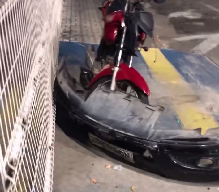 Um motociclista por aplicativo e o passageiro que ele levava ficaram feridos após serem atingidos por um carro desgovernado no cruzamento das ruas Adolfo Hebster com Waldery Uchôa, no bairro Benfica, em Fortaleza. O acidente aconteceu na madrugada da última quinta-feira (19), quando o carro avançou a preferencial em alta velocidade e colidiu violentamente contra a motocicleta.