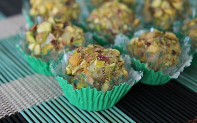 Sirva em colheres apoiadas em um prato com pistache ou enrole docinhos.