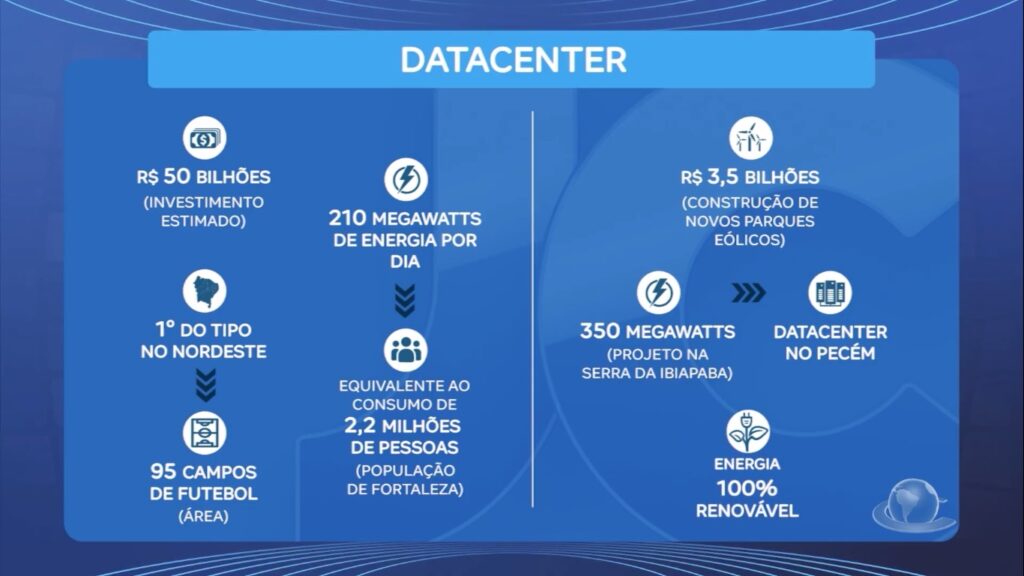 Com investimento estimado em R$ 50 bilhões, o empreendimento será o primeiro do tipo no Nordeste e promete movimentar a economia regional, gerar milhares de empregos e consolidar o estado como um polo tecnológico. A empresa afirma que o projeto será abastecido por energia totalmente renovável, proveniente de novos parques eólicos que estão sendo construídos exclusivamente para o funcionamento da estrutura.