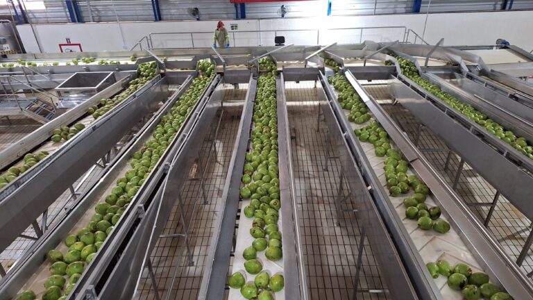 Ao chegar das propriedades rurais, os carregamentos de coco passam por uma inspeção na indústria. Os cocos aprovados nessa etapa seguem para a linha de produção da água de coco. Já no maquinário, os frutos passam por um processo de lavagem – a água utilizada é reaproveitada após um tratamento -, esterilização e corte.