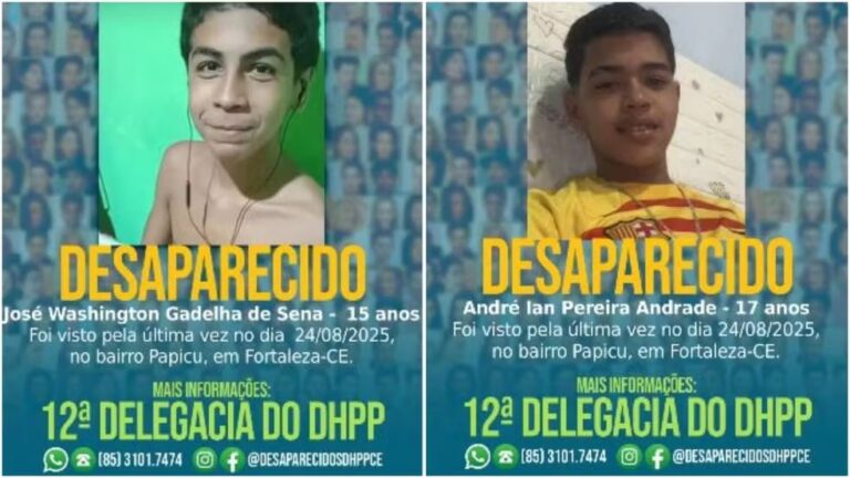 Dois adolescentes desapareceram no último domingo (24) no bairro Papicu, em Fortaleza. José Washington Gadelha de Sena, de 15 anos, e André Ian Pereira de Andrade, de 17, foram vistos pela última vez na comunidade conhecida como Verdes Mares, localizada na divisa entre os bairros Vicente Pinzón e Mucuripe.