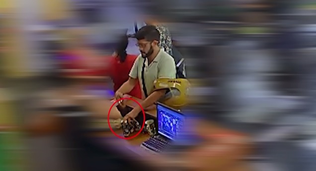 As imagens mostram o suspeito chegando à recepção da academia com um capacete no braço. Ele observa o ambiente enquanto faz pedidos ao atendente, que, em seguida, vai buscar alguns produtos. Nesse momento, o homem solicita sacolas e, ao passar pela catraca, aproveita-se da distração do funcionário para furtar o aparelho telefônico da academia. Sem perceber o furto, o atendente entrega os produtos ao suspeito, que deixa o local tranquilamente.