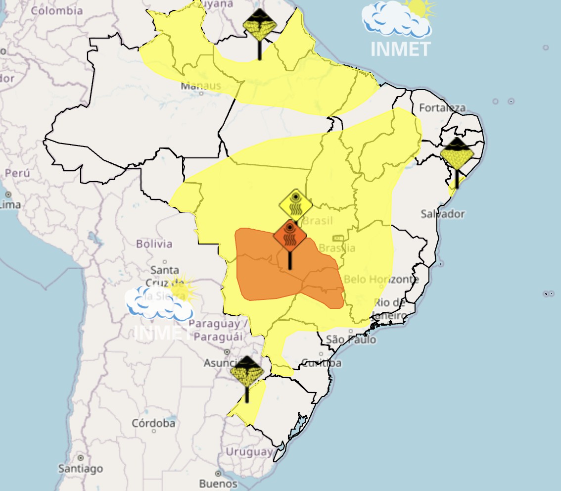Nas demais áreas de Mato Grosso do Sul, Goiás e Distrito Federal, o tempo segue seco e quente, com alerta laranja do Inmet para a baixa umidade do ar, que deve ficar abaixo de 20% entre o norte de Mato Grosso do Sul, leste de Mato Grosso, Goiás e o Distrito Federal.