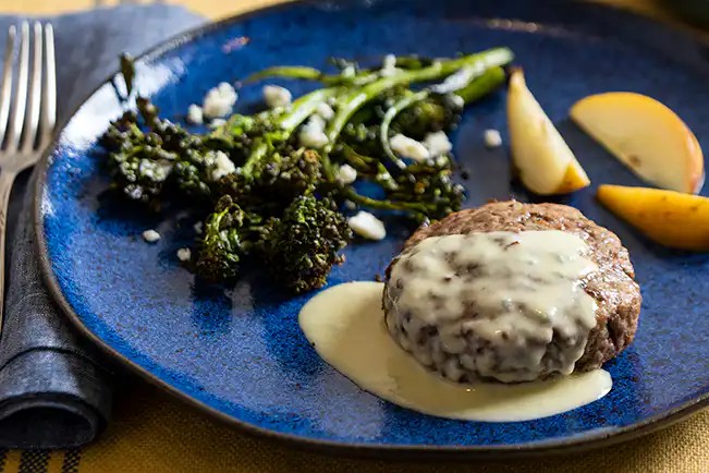 Com uma pinça, transfira o hambúrguer para um prato e deixe descansar por 2 minutos para que os sucos da carne se redistribuam. Sirva a seguir com o brócolis assado, o molho de gorgonzola e pêra marinada.