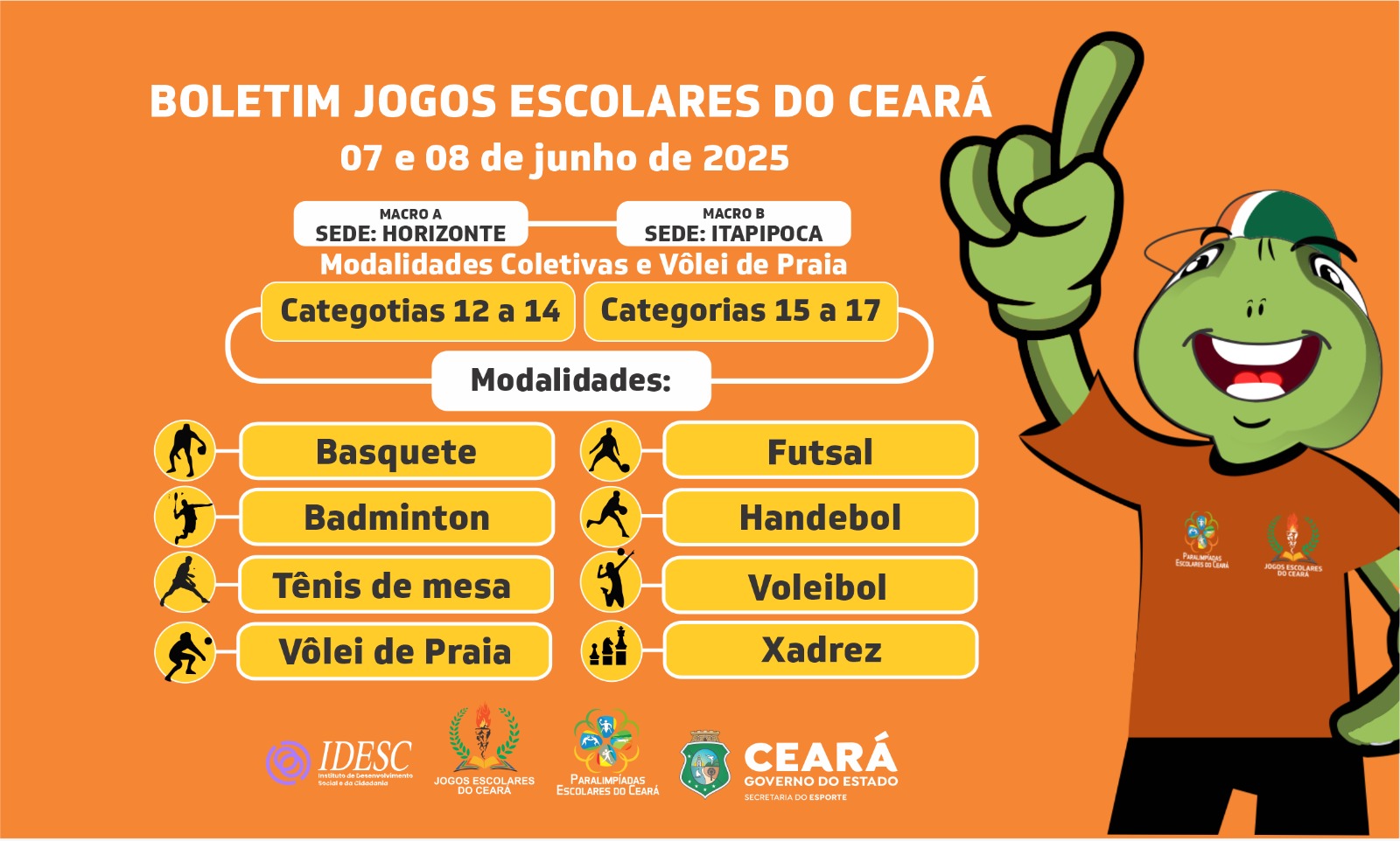 Entre os dias 6 e 8 de junho, a Secretaria do Esporte (Sesporte) realiza a 3ª rodada da fase Macro Regional dos Jogos Escolares do Ceará, nos municípios de Horizonte e Itapipoca. A competição irá contar com a participação de 235 escolas (públicas e particulares), com o envolvimento de 55 municípios.