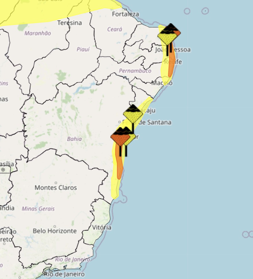 Este cenário será ainda mais intenso entre domingo (18/5) e terça-feira (20/5), conforme indica um aviso laranja do Instituto Nacional de Meteorologia (Inmet) para áreas de Pernambuco, Alagoas e Sergipe, com acumulados de chuva que podem alcançar os 100 mm.