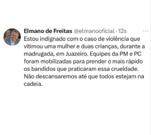 Nas redes sociais, o governador do Ceará, Elmano de Freitas, comentou o caso: “Estou indignado com o caso de violência que vitimou uma mulher e duas crianças, durante a madrugada, em Juazeiro. Equipes da PM e PC foram mobilizadas para prender o mais rápido os bandidos que praticaram essa crueldade. Não descansaremos até que todos estejam na cadeia.”
