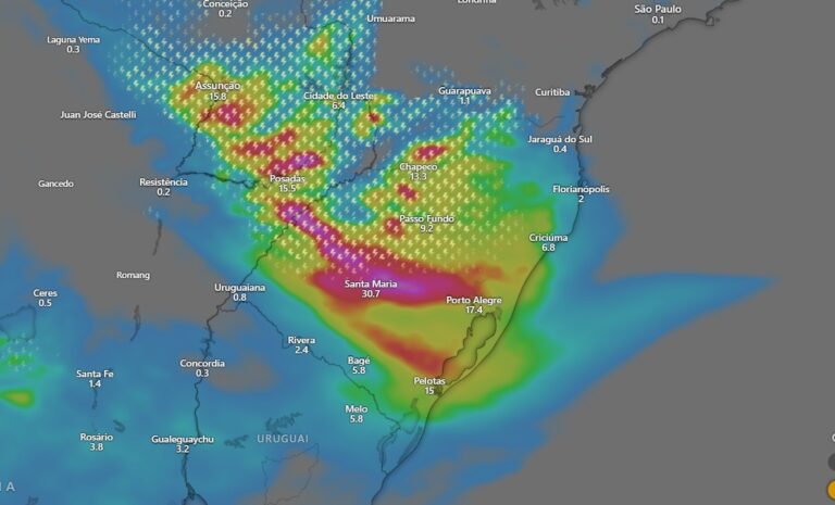 No Rio Grande do Sul, que abriga o ciclone neste momento, a chuva pode ser superior a 100 milímetros em 24 horas, com “grande risco de alagamentos, transbordamentos de rios e deslizamentos de encostas em áreas de risco”.