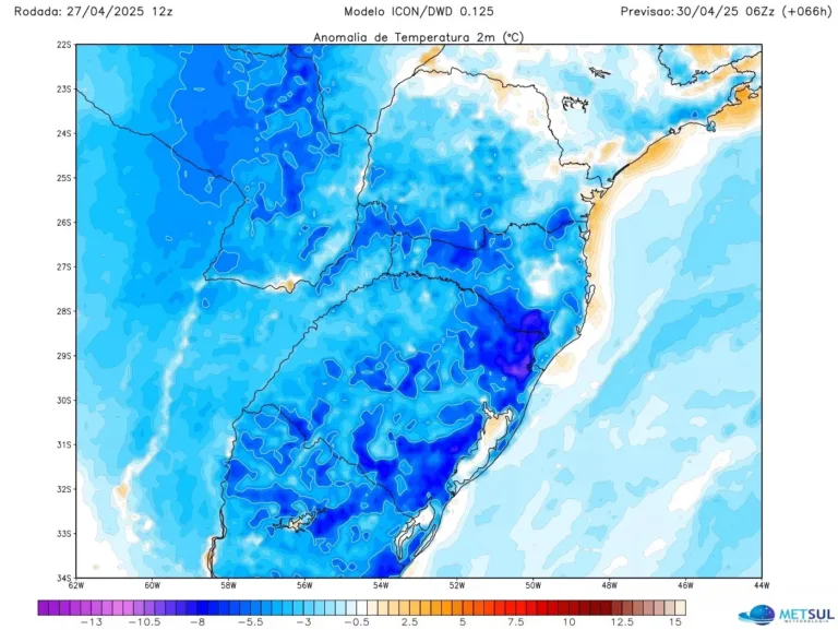 No Sul do Brasil, uma frente fria avança pelo Rio Grande do Sul baixando as temperaturas nos próximos dias, especialmente à noite. A MetSul Meteorologia informa que o tempo segue instável na metade norte do Estado até a segunda-feira (28/4). Mas a previsão é de as condições meteorológicas melhorarem ainda na segunda, com a chegada de uma massa de ar frio e seco.