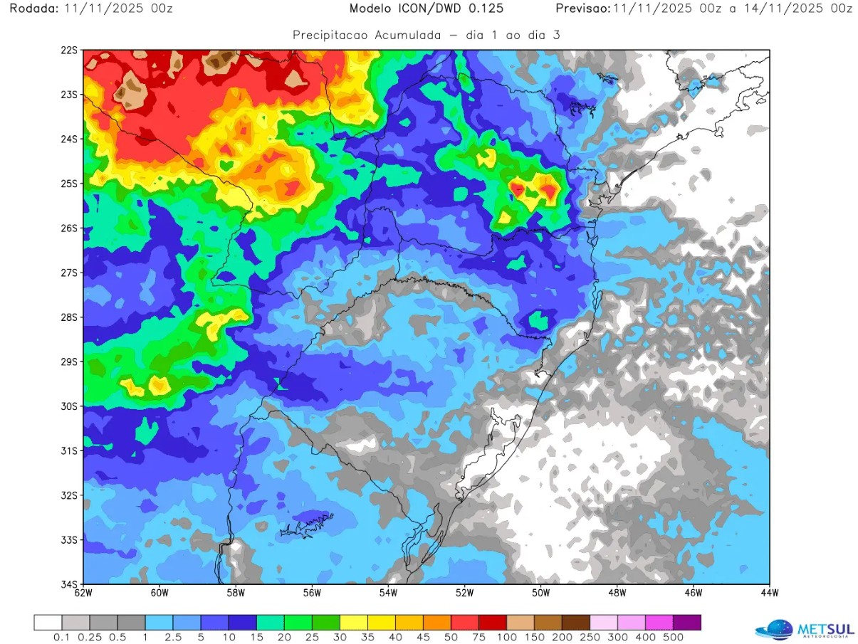 No Sul, o cenário volta a preocupar, especialmente após os estragos provocados pela passagem do ciclone extratropical e da onda de tempestades da última semana. Conforme a MetSul, a chuva retorna à região, mas de forma irregular e menos intensa.