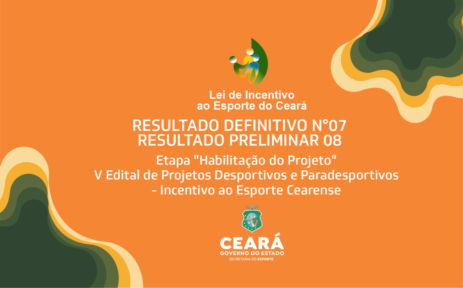 A Secretaria do Esporte do Estado do Ceará divulga, nesta terça-feira (26), o Resultado Definitivo nº 07 e o Resultado Preliminar nº 08 da etapa “Habilitação da Inscrição” do V Edital de Projetos Desportivos e Paradesportivos – Incentivo ao Esporte Cearense.