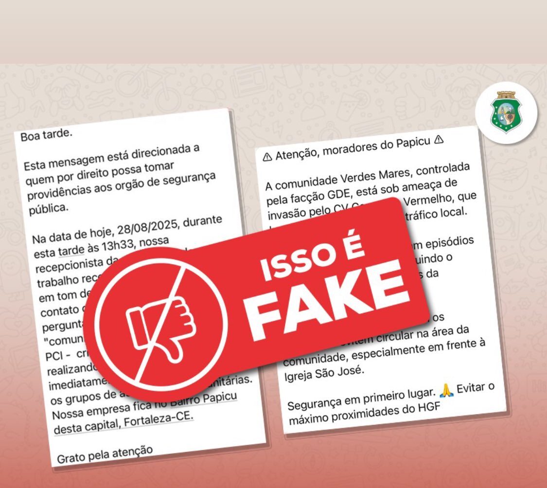 A Secretaria da Segurança Pública e Defesa Social do Ceará (SSPDS) emitiu um alerta, nesta sexta-feira (29), sobre mensagens falsas que estão circulando em grupos de WhatsApp a respeito de supostos conflitos entre facções criminosas no bairro Papicu, em Fortaleza. Segundo o órgão, o conteúdo tem como objetivo gerar pânico entre a população.