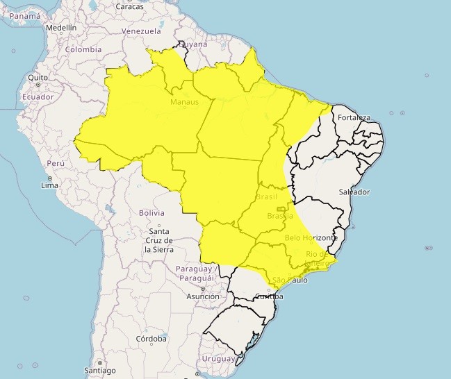 O alerta abrange todos os Estados da região Norte, além de São Paulo, Mato Grosso, Distrito Federal e grande parte de Mato Grosso do Sul, Goiás, Maranhão, Minas Gerais, Rio de Janeiro e o norte do Paraná.