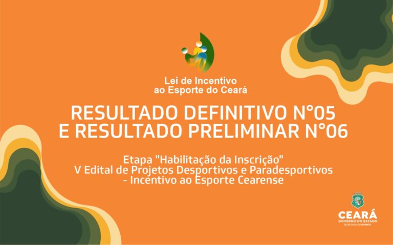 A Secretaria do Esporte do Estado do Ceará divulga, nesta quarta-feira (30), o Resultado Definitivo nº 05 e o Resultado Preliminar nº 06 da etapa “Habilitação da Inscrição” do V Edital de Projetos Desportivos e Paradesportivos – Incentivo ao Esporte Cearense.